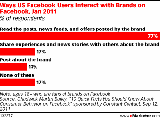17 % der Facebook Nutzer, die sich mit einer Unternehmensseite verbunden haben, verfassen Beiträge zu diesem Unternehmen bzw. Teilen Erfahrungen und Neuigkeiten über die Marke. Weitere 17 % gaben an, dass sie gezielt Posts über die Marke veröffentlichen.
