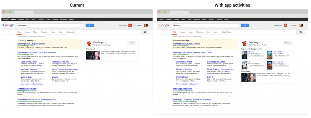 Google setzt seine Strategie konsequent fort und lässt Google+ und die Suche weiter miteinander verschmelzen. Bisher wurden Google+ Accounts und Beiträge von Kontakten in der sozialen Suche angezeigt und jetzt in ein paar Wochen kommen Aktivitäten von Apps mit dazu.