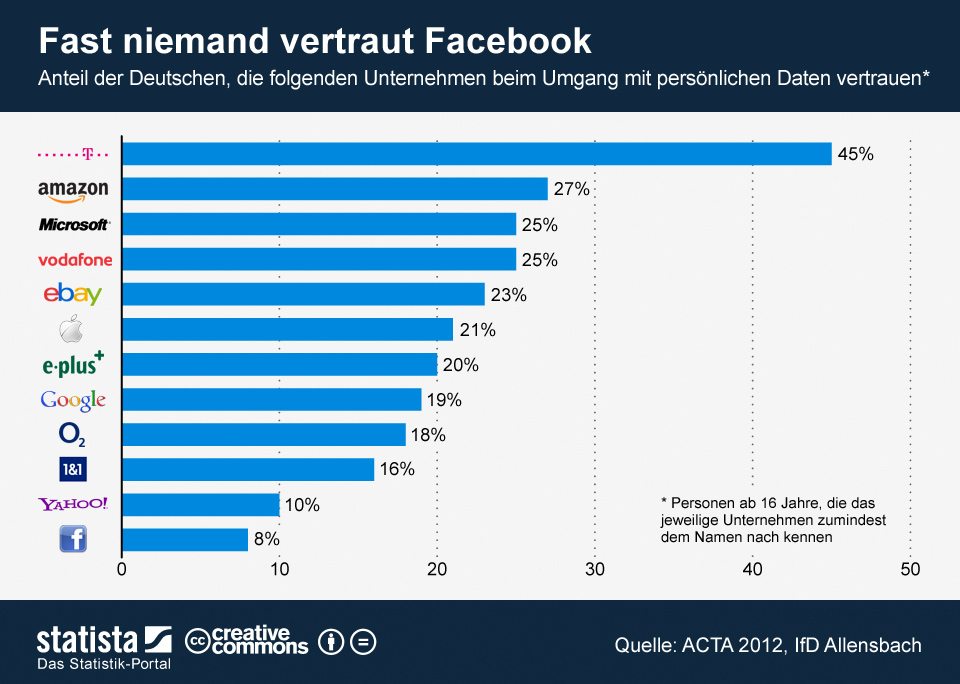 Gerade einmal 8 % der deutschen Internetnutzer vertrauen Facebook beim Umgang mit ihren Daten. Damit liegt Facebook deutlich hinter Unternehmen wie Amazon (27 %), eBay (23 %), Apple (21 %) und Google (19 %).