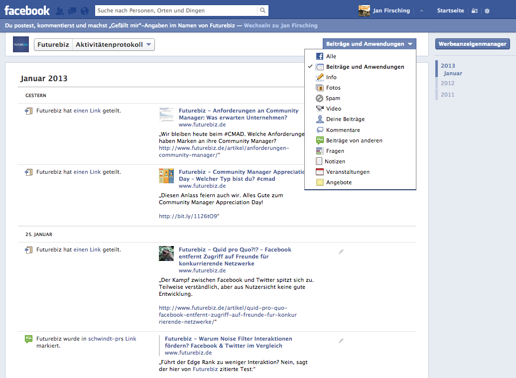 Nützlich ist das Aktivitätenprotokoll vor allem für die Übersicht der eigenen Kommentare und „Beiträgen von anderen“. Community Manager erhalten eine Übersicht darüber, mit welchen Beiträgen und Nutzern sie weiter interagiert haben. Dabei wird nicht nur die Aktivität an sich, sondern auch der Inhalt des Kommentars angezeigt.