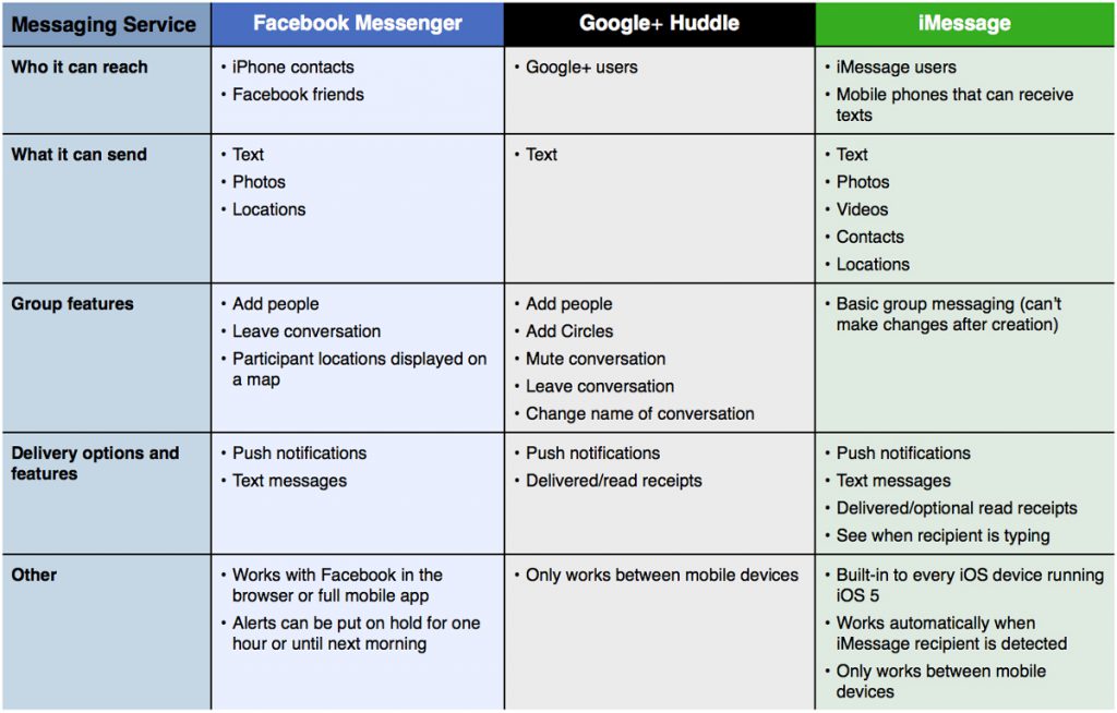 Mit seiner neuen mobilen App „Messenger“ greift Facebook andere Nachrichten Apps wie Google Huddle und iMessage an. Auf gigaOM wurde eine Tabelle veröffentlicht, die eine Übersicht über die unterschiedlichen Features und Funktionen gibt.