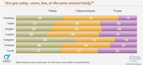 Geht es nach The Social Habbit trifft das gleiche auch für inaktive Nutzer zu. In einer Studie wurden Nutzer gefragt, ob sie Facebook momentan häufiger, seltener, oder genau so oft verwenden, wie in der Vergangenheit. Von Facebook Müdigkeit kann man in den Ergebnissen nichts erkennen.
