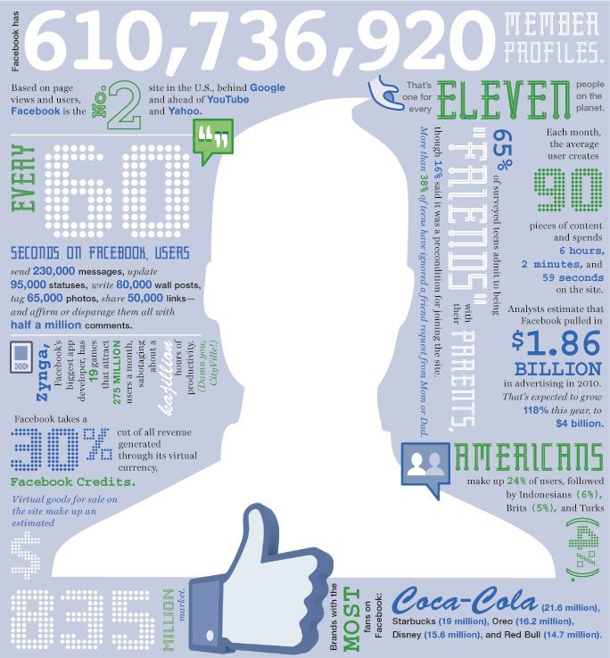 Mal wieder eine nette Infografik zur Facebook Plattform und Nutzung. Laut der Infografik von Fast Company, kommt Facebook auf ca. 611 Mio. Nutzer. Das heißt, jeder elfte Erdbewohner hat ein Facebook Konto. Weitere Statistiken sind: