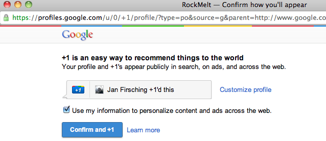 +1 kann im Experimental Bereich von Google aktiviert werden. Ein Google-Konto ist hierfür Voraussetzung. Klickt man auf +1 erscheint ein Dialog-Fenster, in dem der Klick nochmals bestätigt werden muss.