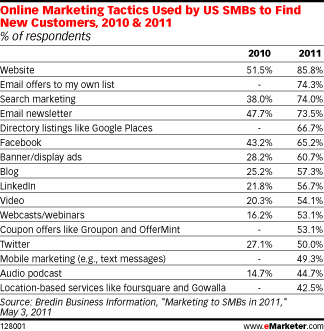 Laut eMarketer setzen über 65 % von US-KMUs bei der Generierung von Neukunden auch auf Facebook. 2010 waren es nur 43,2 %. Facebook ist hiermit bei KMUs beliebter als Twitter. Nur jedes zweite mittelständische Unternehmen nutzt den microblogging Dienst für den Kundenausbau. Dies ist nicht überraschend, da Facebook mehr Möglichkeiten bietet, neue Nutzer auf seine Seite zu bekommen und einen Dialog zu starten.