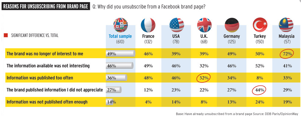 Eine neue Untersuchung von DDB hat sich mit diesem Fall beschäftigt und Nutzer in verschiedenen Ländern dazu befragt. Der Hauptgrund (49 %) für deutsche Facebook Nutzer ist, dass die Marke nicht mehr interessant für die Nutzer ist.