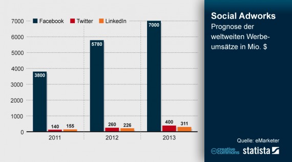 In der Grafik werden auch noch Twitter und LinkedIn mit berücksichtig, aber beide Netzwerke spielen in einer anderen Liga. Aber auch hier kann man eine positive Entwicklung verzeichnen. Speziell die Entwicklung von Twitter könnte interessant werden, da hier immer noch nach einer optimalen Lösung für Werbungtreibende gesucht wird und momentan noch nicht alles optimal verläuft.
